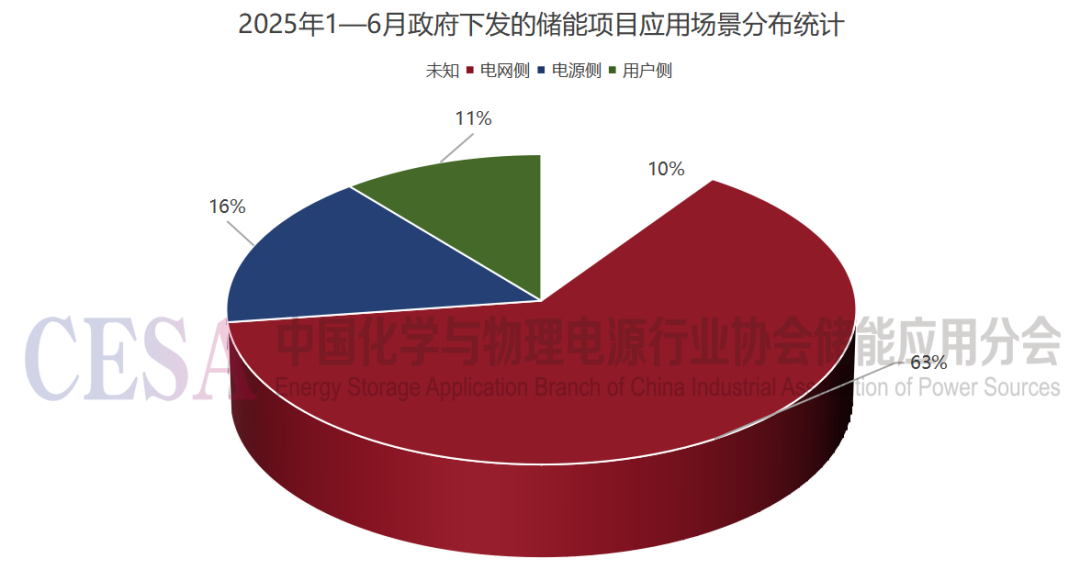 2025年1-6月,我国储能项目应用场景呈现清晰的分布特征。据CESA储能应用分会产业数据库显示,电网侧储能以708个项目占据主导地位,占比超过60%,成为当前储能技术应用的核心领域;电源侧储能项目达182个,占比约16%,主要服务于新能源发电配套与电力调峰需求;用户侧储能项目123个,占比约11%,反映出工商业与居民端储能应用正逐步拓展。