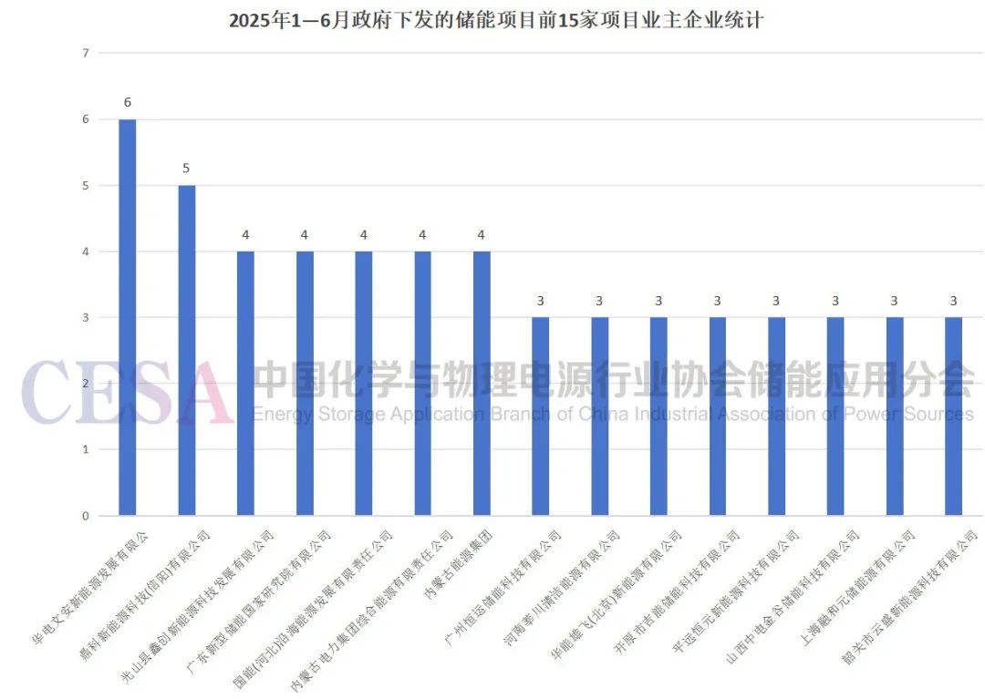 2025年1—6月政府发布的储能项目中,前15家项目业主企业及其项目数量分别为:华电文安新能源发展有限公司6个,鼎科新能源科技信阳有限公司5个,光山县鑫创新能源科技发展有限公司、广东新型储能国家研究院有限公司、国能河北沿海能源发展有限责任公司、内蒙古电力集团综合能源有限责任公司、内蒙古能源集团各4个,广州恒运储能科技有限公司、河南莘川清洁能源有限公司、华能雄飞北京新能源有限公司、开原市吉能储能科技有限公司、平远恒元新能源科技有限公司、山西中电金谷储能科技有限公司、上海融和元储能源有限公司、韶关市云盛新能源科技有限公司各3个。