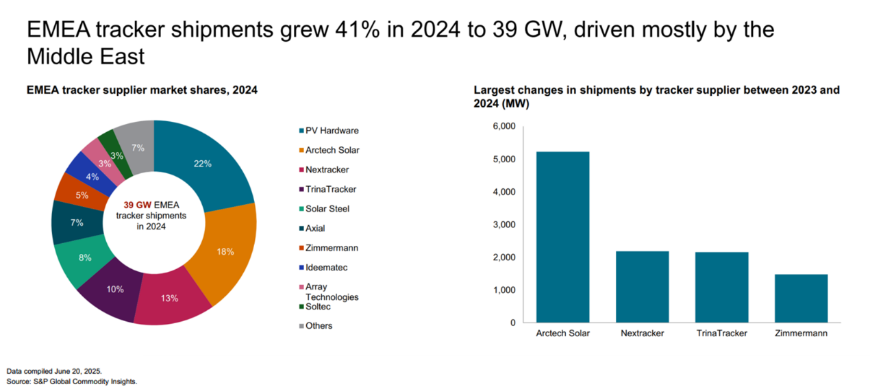 在标普全球报告中,EMEA地区出货量绝对增量最高,从27GW增至41GW,其中中东地区贡献了7.6GW的增量。与2023年相比,该地区出货量涨幅前三的跟踪支架供应商中,中国企业天合跟踪排名第三。