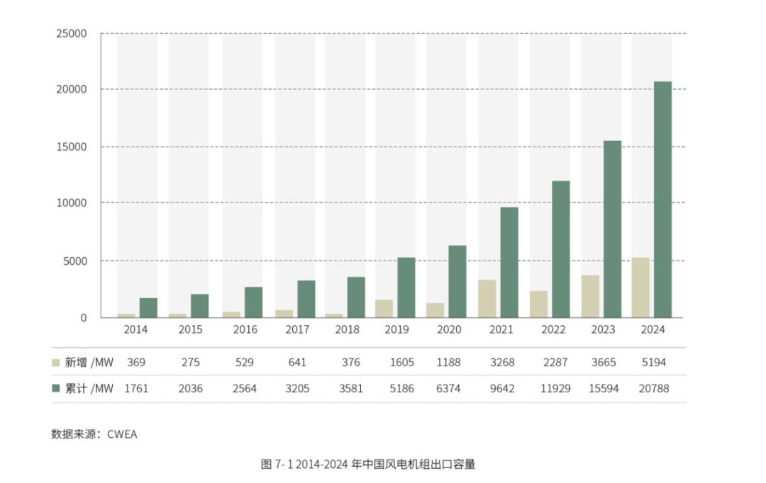 据海关总署在国务院新闻发布会上的介绍,2024年和2025年上半年,中国风力发电机组出口增速分别达到71.9%和超过两成。