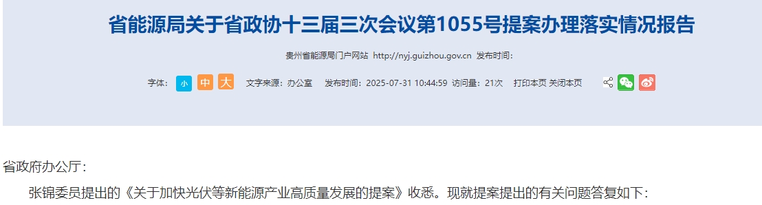 (四)关于提高本地电量消纳能力的建议。省投促局按照《贵州省新能源动力电池及材料研发生产基地建设规划(2022 - 2030年)》重点推进产业招商。针对光伏发电集中地区,立足资源与产业基础,指导市(州)梳理目标企业,精准开展招商活动。聚焦光伏产业链,重点在电池片、组件、逆变器等关键环节及储能、智能电网等配套产业,提升本地企业新能源电量消纳水平。通过举办投资机遇座谈会、招商推介会及借助展会平台,宣传我省光伏产业优势与战略布局,吸引龙头企业来黔考察、洽谈合作项目。2024年以来,成功招引长通一道光伏组件生产、织金县磷煤化工、上海电气风机产业园、盘州市煤-焦-化综合能源循环经济项目等重大产业分别落地威宁、织金、龙里、盘州等新能源资源富集区域。通过增加用电负荷、优化调节用电时段等,提升风电光伏新能源资源富集区域新能源消纳能力。