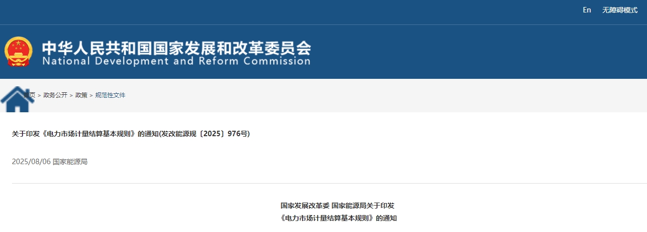关于印发《电力市场计量结算基本规则》的通知(发改能源规〔2025〕976号)