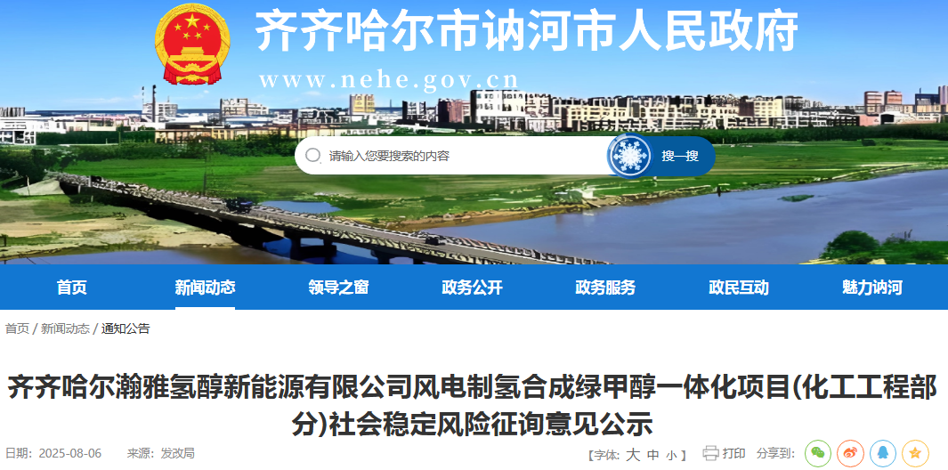 8月6日,齐齐哈尔市讷河市人民政府发布《齐齐哈尔瀚雅氢醇新能源有限公司风电制氢合成绿甲醇一体化项目(化工工程部分)社会稳定风险征询意见公示》。