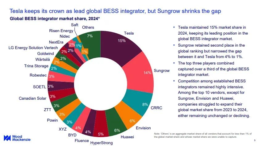 根据报告,特斯拉在2024年以15%的市场份额连续第二年保持其在电池储能系统集成商市场的领先地位,蝉联榜首。