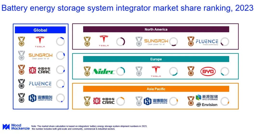 与2023年相比,特斯拉、阳光电源、中车株洲所继续巩固Top3的位置,远景和华为冲进2024全球Top5,Fluence落榜。值得一提的是,2024年前三排名虽未发生变化,但阳光电源将特斯拉的领先优势从2023年的4个百分点缩小至2024年的仅1个百分点,大幅缩减了差距。