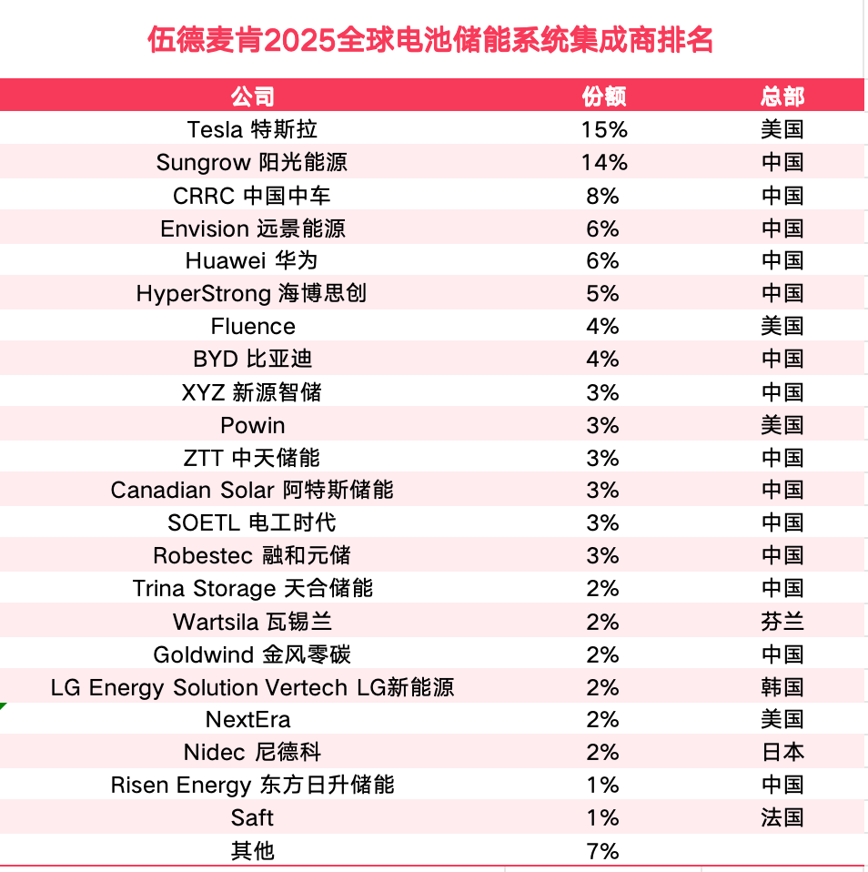 如今,这股力量已不容忽视——在伍德麦肯兹公布的2025年全球电池储能系统集成商排名中,天合储能、东方日升、阿特斯等光伏系企业已经崭露头角。