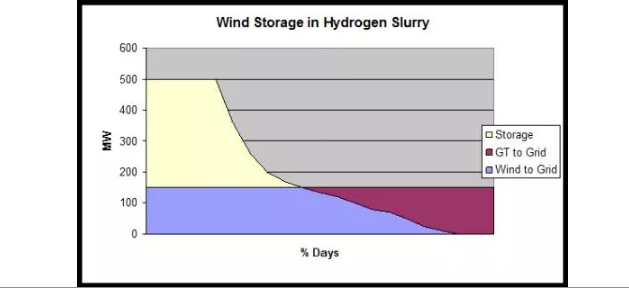 其二是使用氢悬浮液将风能储存起来。风不可能一年四季不间断的吹,而电网又不能仅仅依靠风力发电供应所有的电能。一般说来,风力发电厂输出的电能只有15%可作为可靠能量。这意味着对于一个500兆瓦的风力发电厂,仅仅有75兆瓦被ISO视为可发电的能量。通常为保证风力发电输出电能的稳定性,需要附加一个天然气电厂,这就在一定程度上影响了风力发电的零碳排放。以下是一个500兆瓦风力发电厂提供的150兆瓦发电量100%用氢储存并驱动燃气轮机发电的例子。在这个例子中,ISO认为风力发电占电网30%的电能。