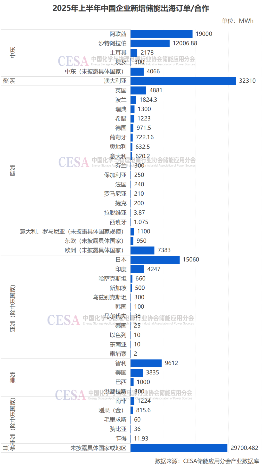 海外市场则呈现爆发式增长,据CESA储能应用分会产业数据库统计,2025年1月—6月,中国企业新获199个海外储能订单/合作,总规模超160GWh,同比增长220.28%。