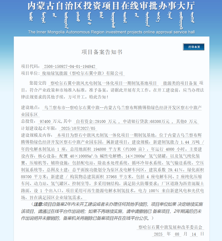 据内蒙古内蒙古自治区投资项目在线审批办事大厅信息,8月14日,俊瑞绿氢能源(察哈尔右翼中旗)有限公司提交的察哈尔右翼中旗风光电制氢一体化项目一期制氢基地项目,备案通过。