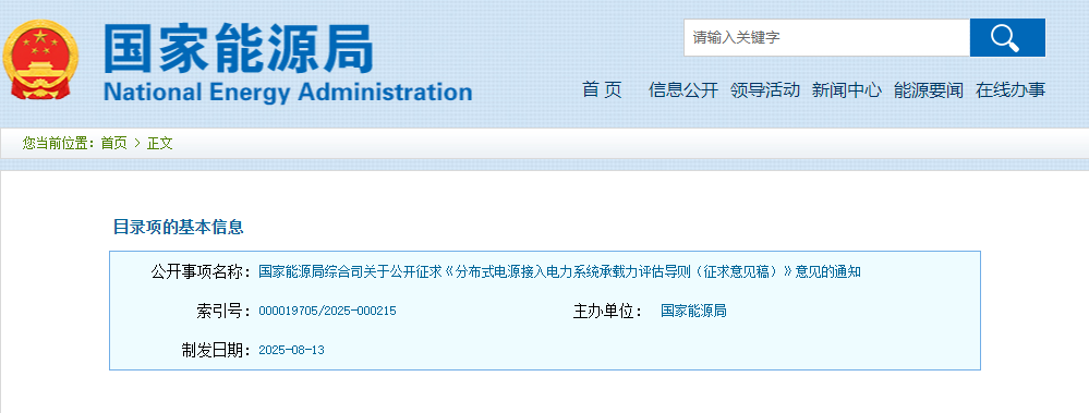 为贯彻落实党的二十届三中全会关于完善新能源消纳和调控政策措施的要求,进一步释放提升配电网对分布式新能源的接纳、配置和调控能力,按照国家能源局能源领域行业标准制修订计划,我局组织有关单位对《分布式电源接入电网承载力评估导则》(DL/T 2041-2019)进行了修订,形成《分布式电源接入电力系统承载力评估导则(征求意见稿)》,现向社会公开征求意见。
