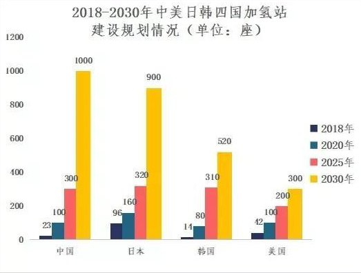 加氢站作为氢能产业上关键一环,直接制约了燃料电池汽车的发展。数据显示,2018年全球新增48座加氢站,截止到2018年底,全球加氢站数目达到369座。其中,日本凭借96座加氢站位居全球第一;德国和美国排名第二和第三,加氢站数量分别为60座与42座;日、德、美三个国家加氢站共有198座,占全球总数的54%。此外,截至2018年底,我国加氢站数量为23座,位居全球第四,根据目前的规划布局,到2020年,我国加氢站数量将达到100座,燃料电池车辆突破10000辆。