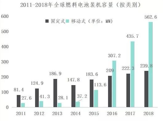 燃料电池是目前氢能源下游主要应用场景之一。国际能源署数据显示,2018年全球燃料电池的装机量约803MW,同比增长22%;其中移动类装机量562.6MW,同比增长29.17%;固定式装机量239.8MW,比上年增长7.87%。截至2018年底,全球燃料电池汽车保有量超过15,000辆,其中美国约6500辆,为全球第一;中、日、韩三国保有量分别为3500、2700、2000辆;其中我国燃料电池车基本为商用车,美、日、韩三国以乘用车为主。在其他领域,美国目前还有超过2万辆燃料电池叉车,累计加氢600万次。