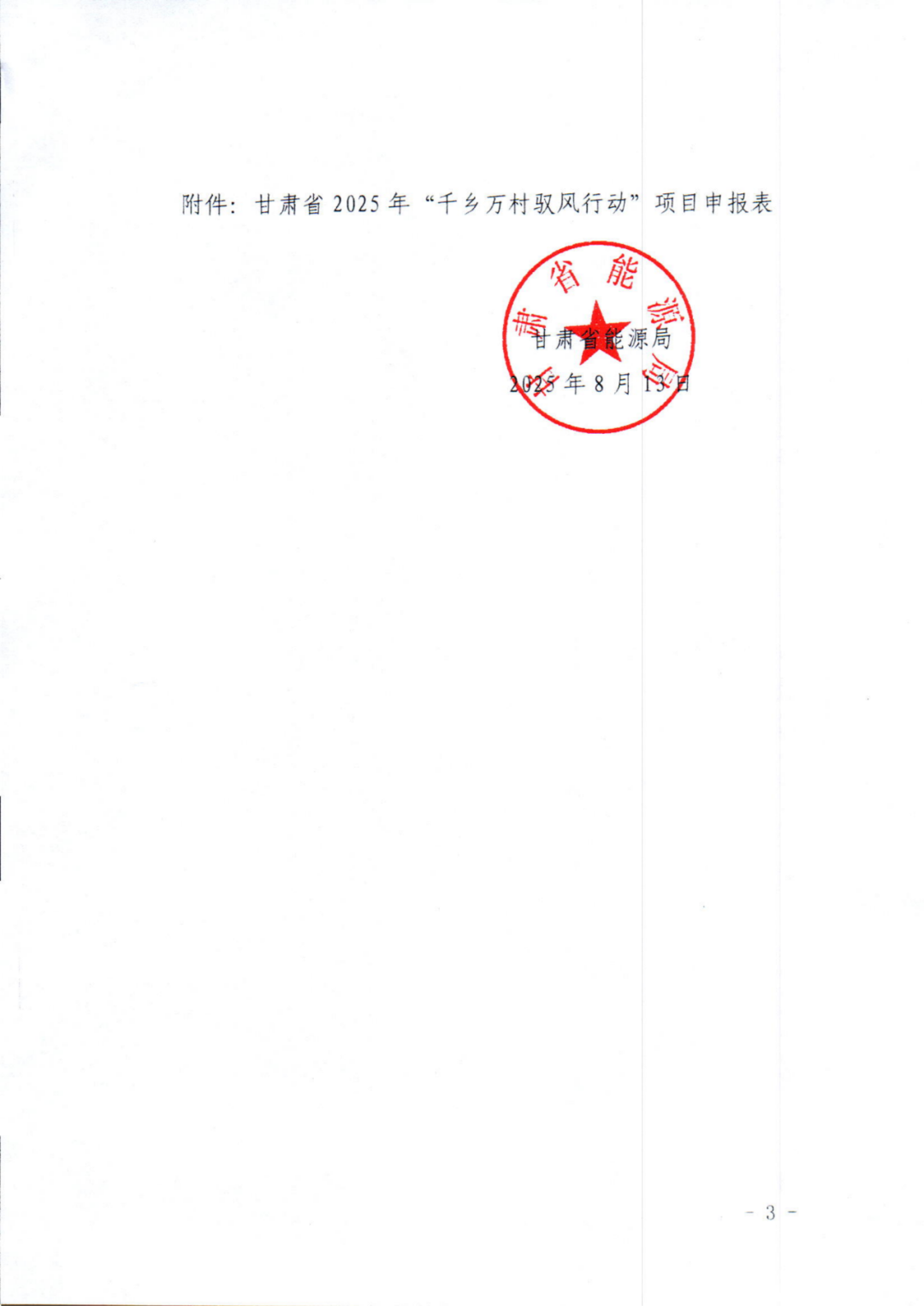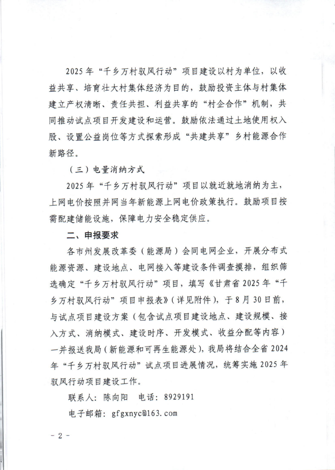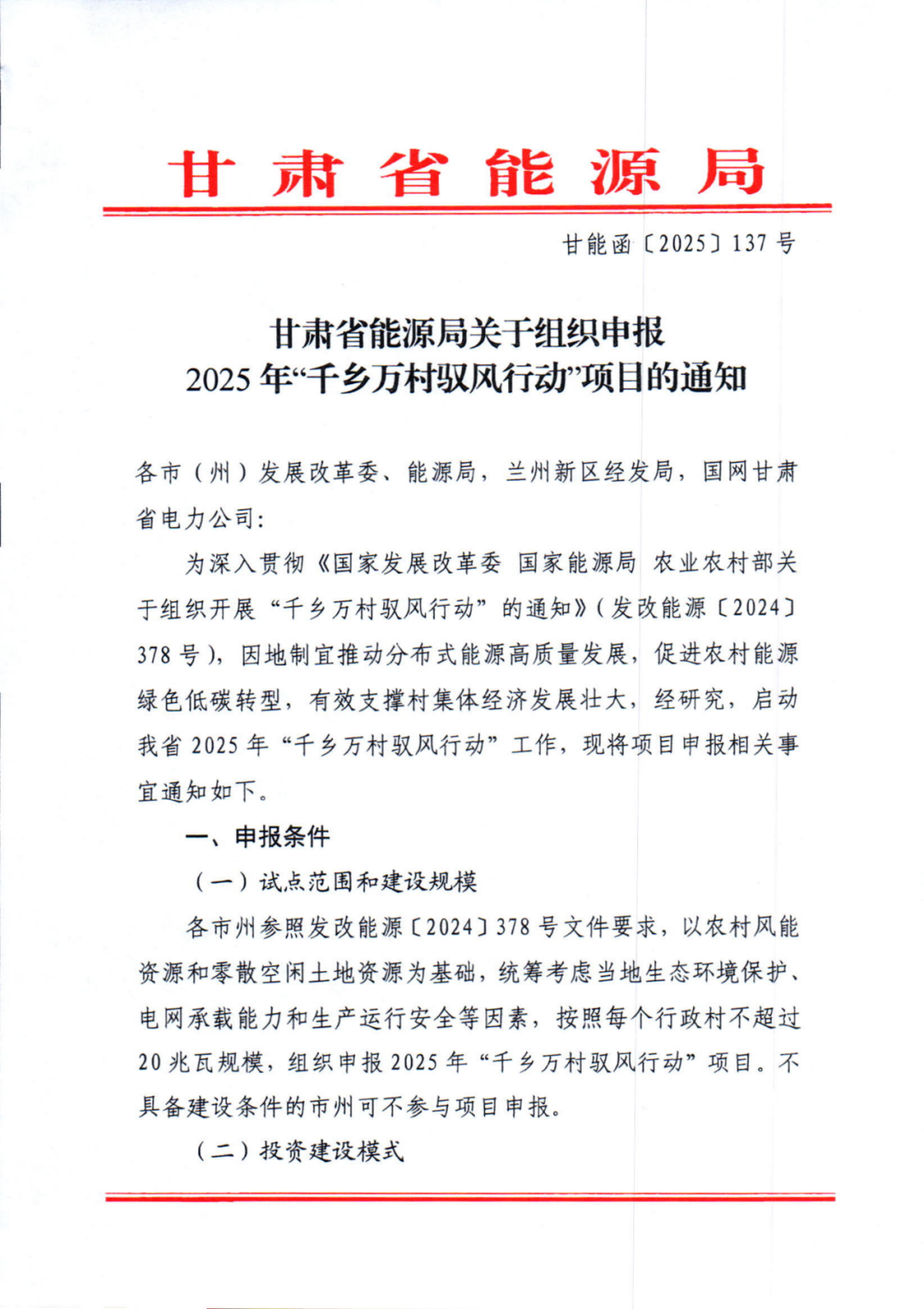 近日,甘肃省能源局发布《关于组织申报2025年“千乡万村驭风行动”项目的通知》。