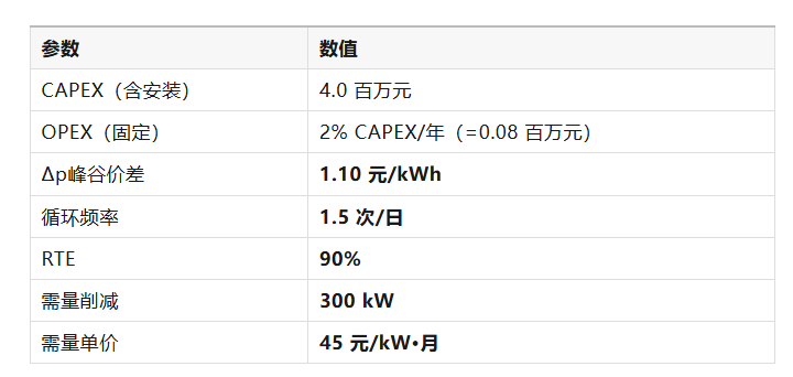 年净收益= 峰谷套利收益 + 需量管理节省 +(响应/辅助服务) − 运维与折旧性支出