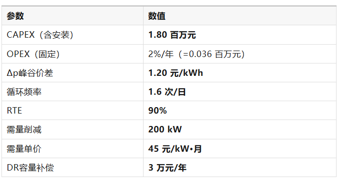 结论:价差与循环达标但CAPEX偏高,约3.4年;若引入DR 6万元/年或需量单价上浮至50元/kW·月,回本可压至~3.2年。