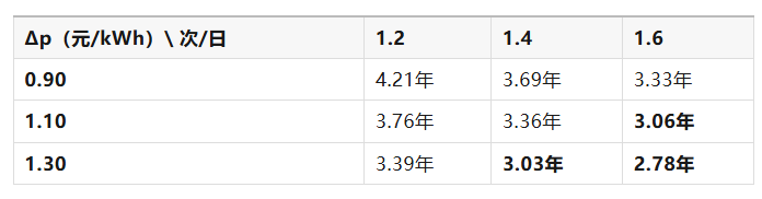 读表:只要Δp≥1.1且有效循环≥1.6次/日,在4.0百万元级CAPEX下即可逼近3.0年;若同步优化CAPEX与需量节省,即可稳定穿越3年线。