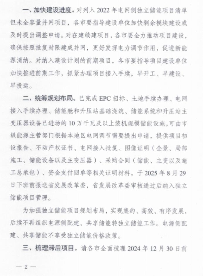 对已完成EPC招标、土地手续办理、电网接入手续办理、储能舱和升压站基础浇筑、储能系统和升压站主变压器设备已进场的10万千瓦及以上装机规模储能设施,可由市级能源主管部门根据本地区电网调节需要提出申请,提供项目初设报告、不动产权证书、电网接入批复、图像证明(全景、局部施工、储能设备以及主变压器)、采购合同(储能、主变以及施工总承包)、资金支付回单等相关证明材料,于2025年8月29日下班前报送省发展改革委,省发展改革委审核通过后纳入独立储能项目管理。
