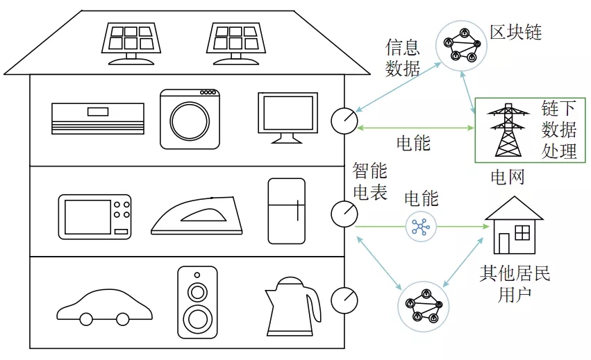 推动以家庭为单位的基于区块链技术的分布式能源项目建设。采用与区块链相连的智能电能表记录家庭电器、光伏电池等之间的电力流动,对于生产出的多余电力,既可以出售给邻近电力用户,实现家庭用户之间进行电能互济,引导用户积极参与清洁电能的生产,进一步地减少分布式电力对电网的波动,也可以出售给电网。与区块链相连的电网获得多余的电力及数据后,在链下对订单进行撮合匹配,将电力卖给其他用户(如图3所示)。