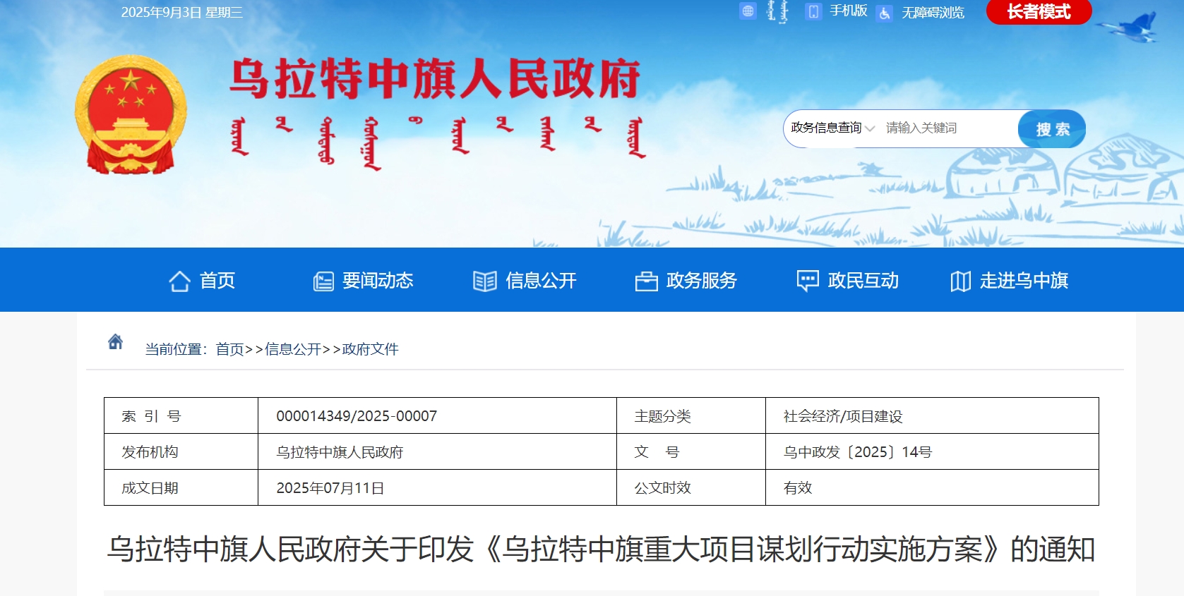 9月2日,内蒙古巴彦淖尔市乌拉特中旗人民政府印发《乌拉特中旗重大项目谋划行动实施方案》。