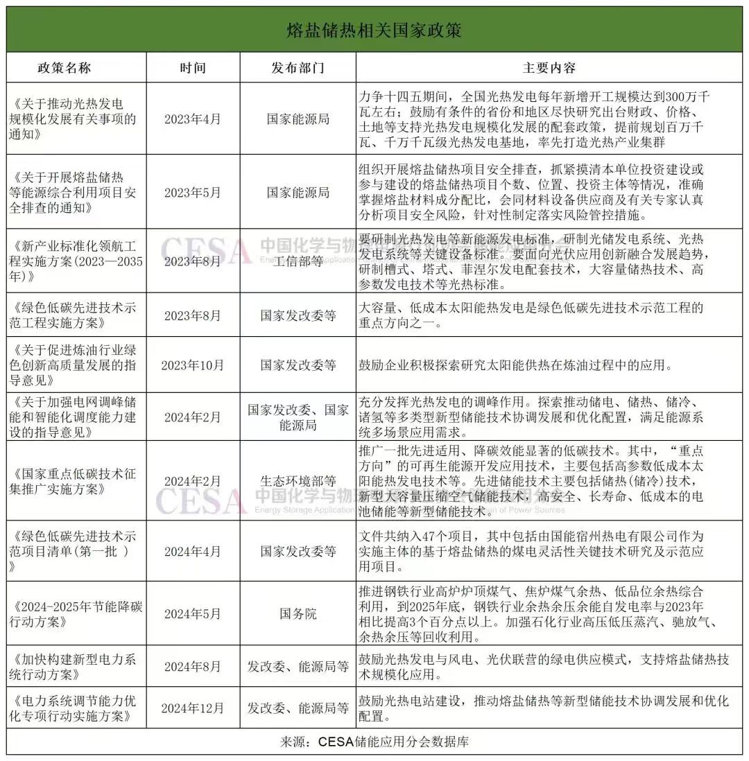 国家层面的政策主要表现在熔盐储热相关应用领域拓展、技术标准建设以及技术推广受到政策支持和重视。