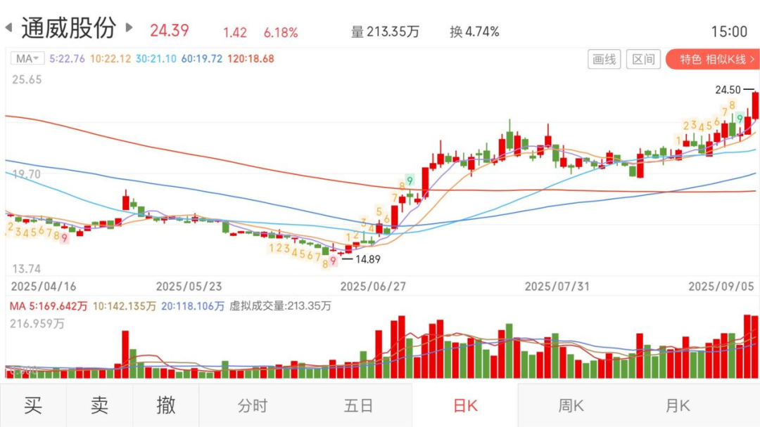 值得一提的是,9月1日,通威股份以22.58元/股收盘,总市值突破千亿(1016.54亿元)。这也是其在2024年4月25日跌破千亿后首次收盘回归“千亿俱乐部”。经过5个交易日考验后,如今完全站稳千亿。