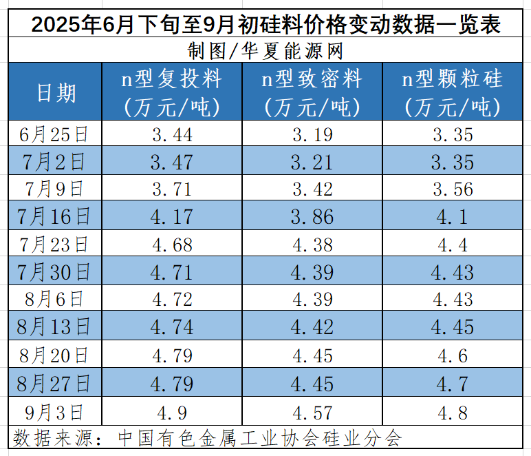 据硅业分会数据,截至9月3日,n型复投料和n型致密料的成交均价分别达到4.9万元/吨和4.57万元/吨,相比6月25日分别上涨了1.46万元和1.38万元,创下42%和43%的涨幅。就连颗粒硅也从3.35万元/吨涨到了4.8万元/吨,涨幅也达到了43%。