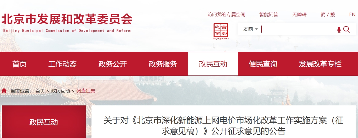 9月5日,北京市发改委就《北京市深化新能源上网电价市场化改革工作实施方案》公开征求意见。