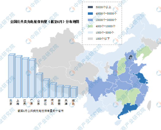 截至6月公共充电桩保有量上,北京市排名第一,保有量达51774个,是唯一一个公共充电桩数量超五万个的地区。上海、江苏、广东随后,公共充电桩数量分别为49581个、47330个、46753个,到此为第二阶梯,充电桩保有量在四万个以上。