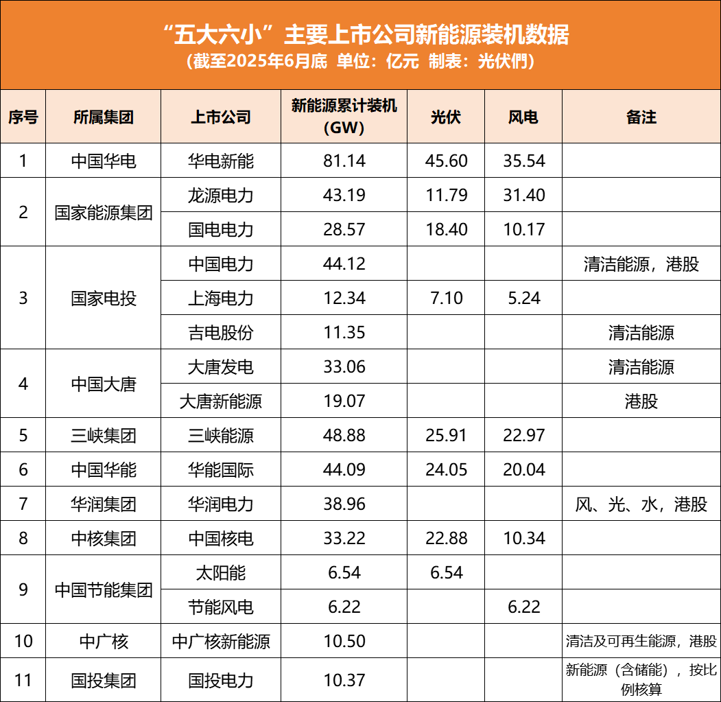 根据最新披露的2025年半年报,光伏們将“五大六小”旗下主要上市公司的新能源装机、发电量、上网电量以及利润等关键数据统一摘录、梳理。