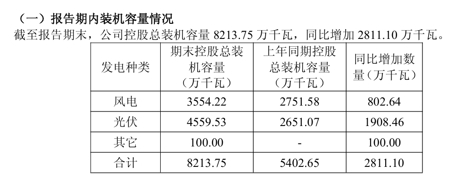 报告期内,公司新增并网装机218.07万千瓦,其中风电新增并网53.81万千瓦,太阳能发电 新增并网164.26万千瓦。新增获取核准/备案项目容量400.56万千瓦,在建项目计划装机容量合 计1381.78 万千瓦。报告期末公司待建新能源项目计划装机容量2696.49万千瓦,其中风电 1143.13 万千瓦,太阳能发电1543.36万千瓦,储能10万千瓦。