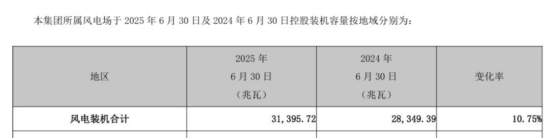 截至2025年6月30日,公司风电装机容量为20,038兆瓦(含海上风电5,880兆瓦),太阳能装 机容量为24,050兆瓦,水电装机容量为370兆瓦,天然气发电装机容量为15,232兆瓦,生物质能 源装机容量为160兆瓦,低碳清洁能源装机容量占比提升至39.12%。
