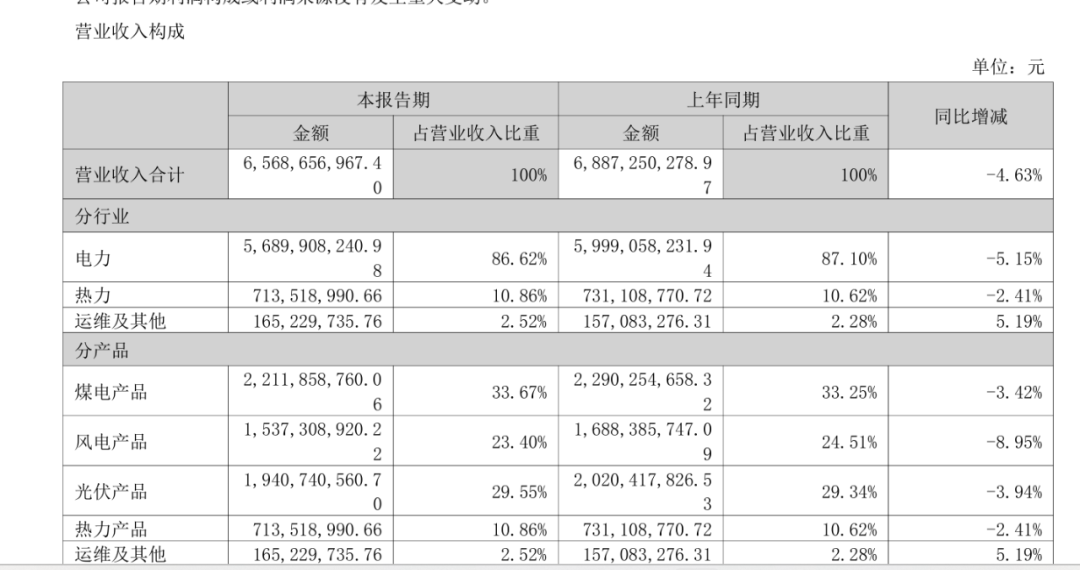 2025 年上半年,在电力量价下行的市场形势下,公司逆势求进,突出价值创造,实现营业收 入776.55 亿元,同比减少9.52%;归属于上市公司股东的净利润36.87亿元,同比减少45.11%, 其中火电板块19.67亿元,水电板块8.83亿元,风电及光伏板块11.20亿元。