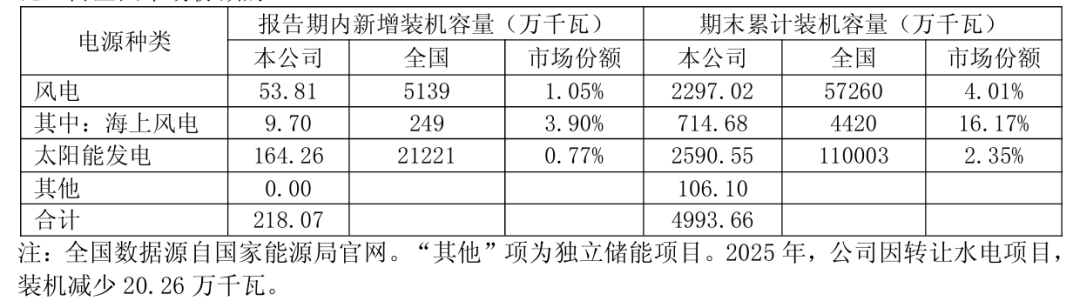 2025 年上半年,公司新增装机容量218.07万千瓦,累计装机容量达到4993.66万千瓦。风电累计装机容量达到2297.02万千瓦,占全国风力发电行业市场份额的4.01%,其中海上风电累计装机容量714.68万千瓦,占全国市场份额的16.17%;太阳能发电累计装机容量达到2590.55 万千瓦,占全国太阳能发电行业市场份额的2.35%,其中集中式光伏累计装机容量2523.69万千 瓦,占全国市场份额的4.16%。