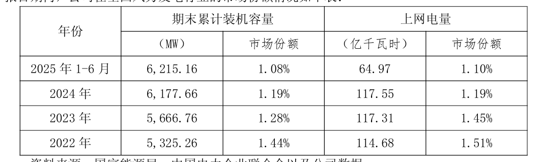 截至2025年6月30日,公司实现风电累计装机容量6,215.16MW,权益装机容量5,980.86MW。