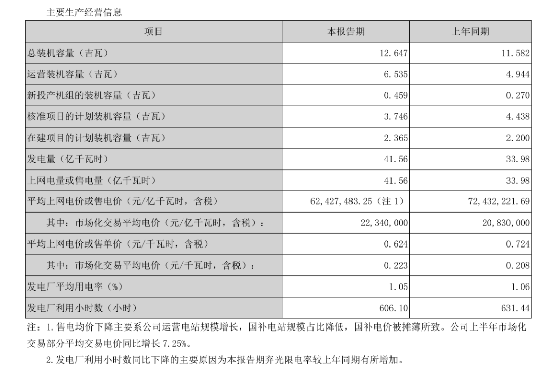 2025 年上半年,公司积极应对“量价双降”市场形势,聚力价值创造和市场竞争力提升。平均上网电价409.70元/兆瓦时,同比下降29.51元/兆瓦时。参与市场化交易电量1793.52亿千瓦 时,占上网电量的91.60%,煤机电价较基准价上浮12.56%。受电力供需总体宽松,新能源出力挤压常规能源发电空间等因素影响,公司发电设备平均利用小时完成1761小时,同比下降262小时, 其中:火电完成2155小时,同比下降248小时;水电完成1530小时,同比下降105小时;风电 完成1127小时,同比增加22小时;光伏完成606小时,同比增加81小时。供热量完成1.13亿吉焦,同比增长1.41%。公司将继续强化生产运营组织,加强生产管控,全力稳量保价。