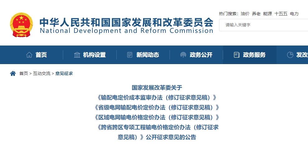 9月8日,国家发改委发布关于《输配电定价成本监审办法(修订征求意见稿)》《省级电网输配电价定价办法(修订征求意见稿)》《区域电网输电价格定价办法(修订征求意见稿)》《跨省跨区专项工程输电价格定价办法(修订征求意见稿)》公开征求意见的公告。