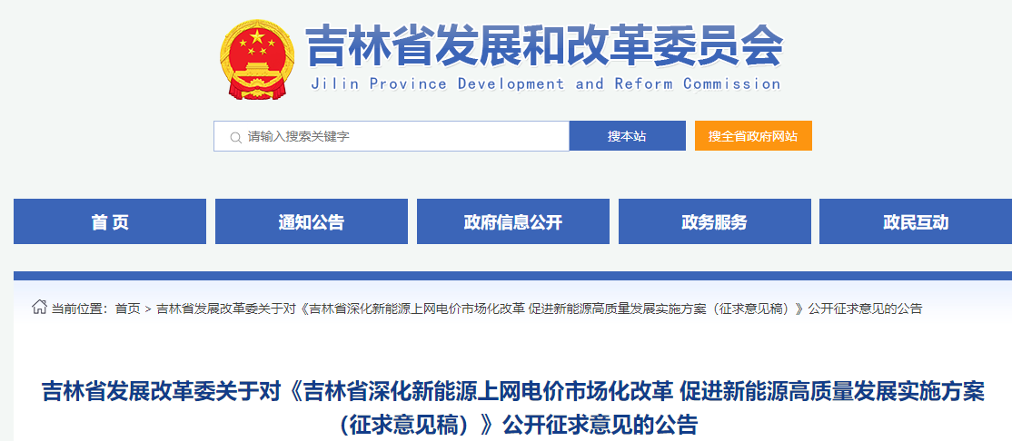 吉林省发展改革委关于对《吉林省深化新能源上网电价市场化改革 促进新能源高质量发展实施方案(征求意见稿)》公开征求意见的公告