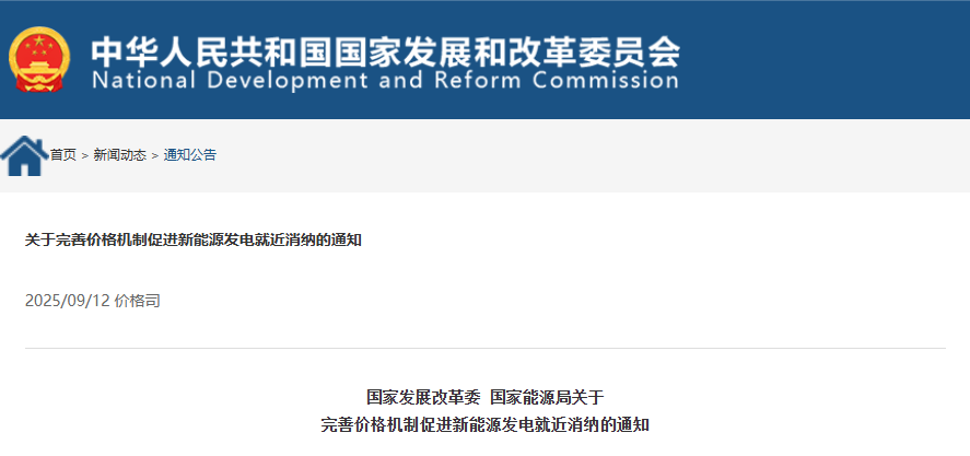 9月12日,国家发展改革委 国家能源局发布《关于完善价格机制促进新能源发电就近消纳》的通知。