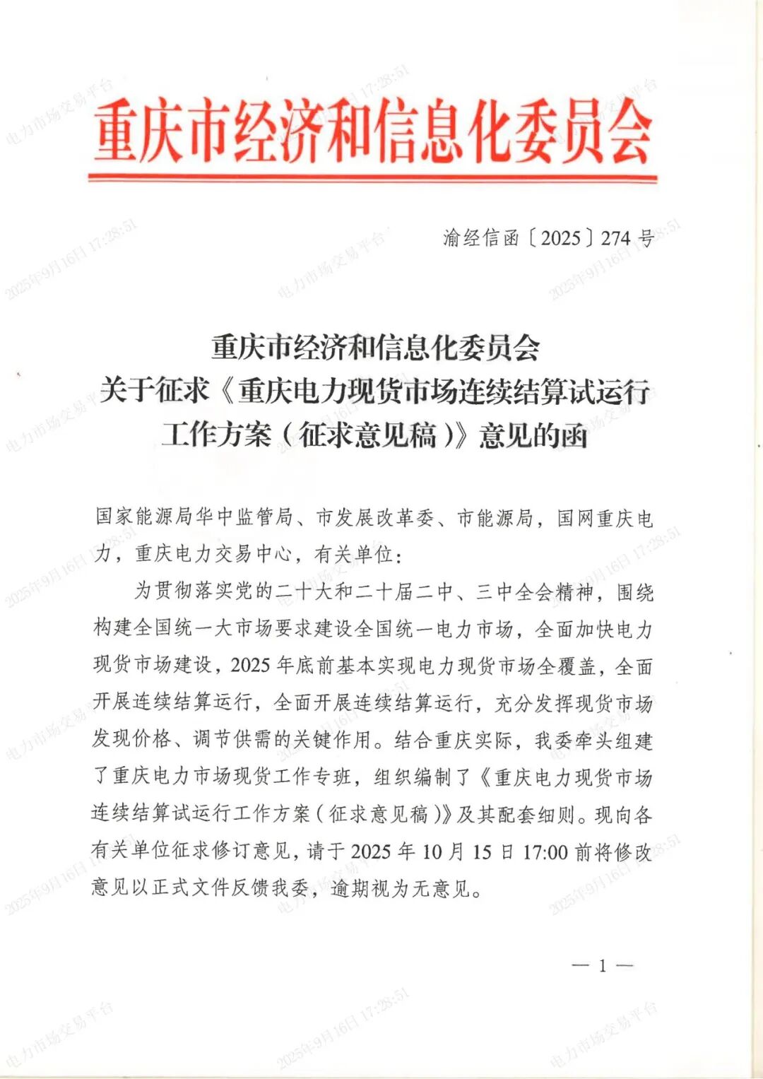 获悉,9月15日,重庆电力交易中心转发重庆市经济和信息化委员会《重庆电力现货市场连续结算试运行工作方案(征求意见稿)》。