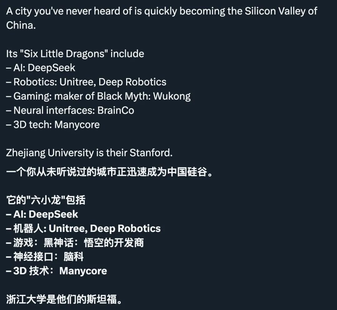 今年2月,英国《经济学人》在一篇关于DeepSeek 的专题报道里,点名浙江大学是这家公司的背后推手之一,并直接拿“杭州与浙大”类比“硅谷与斯坦福”。