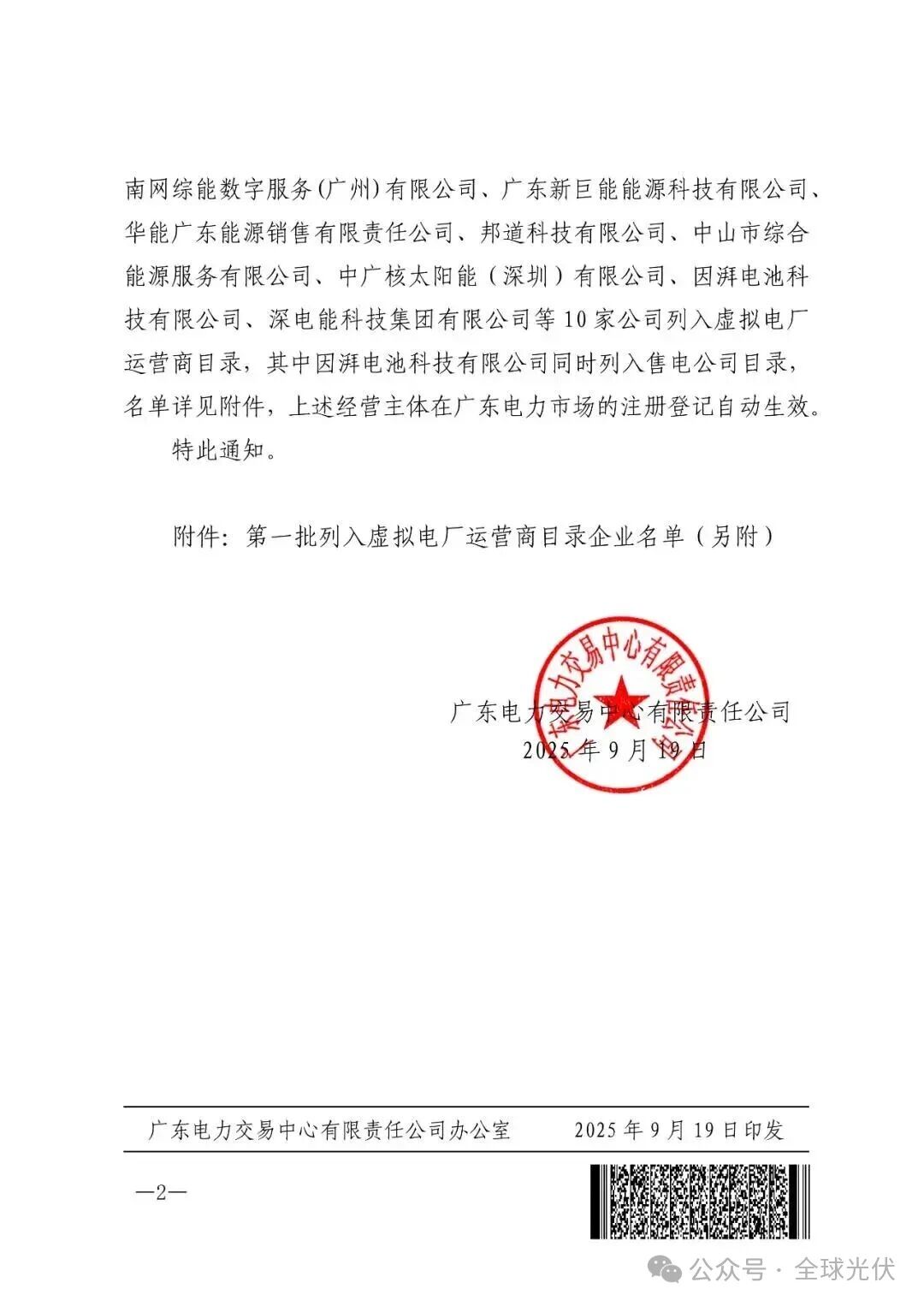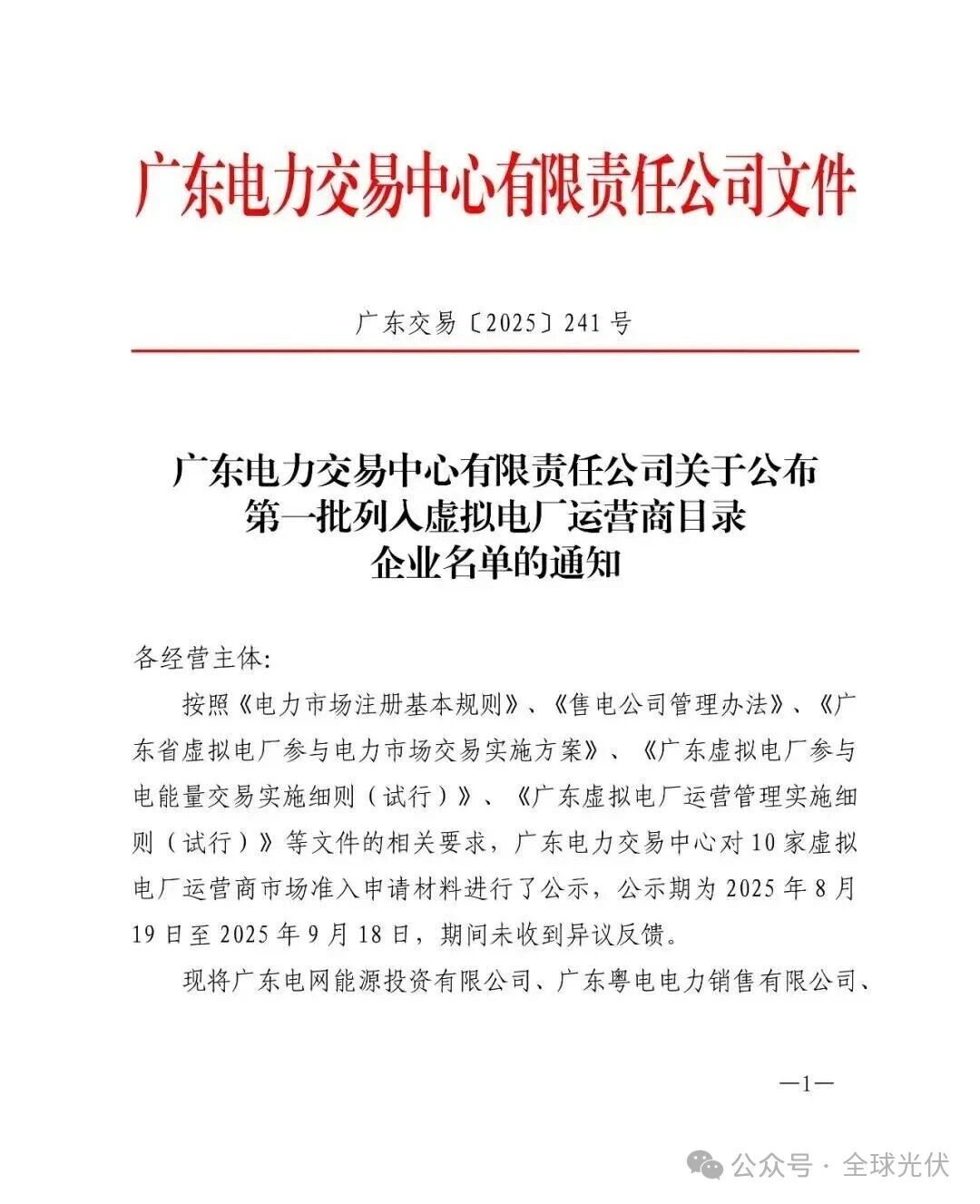 此次名单确定依据《电力市场注册基本规则》《售电公司管理办法》《广东省虚拟电厂参与电力市场交易实施方案》等多份文件要求。此前,广东电力交易中心已对10家虚拟电厂运营商的市场准入申请材料进行公示,公示期为2025年8月19日至9月18日,公示期间未收到异议反馈。