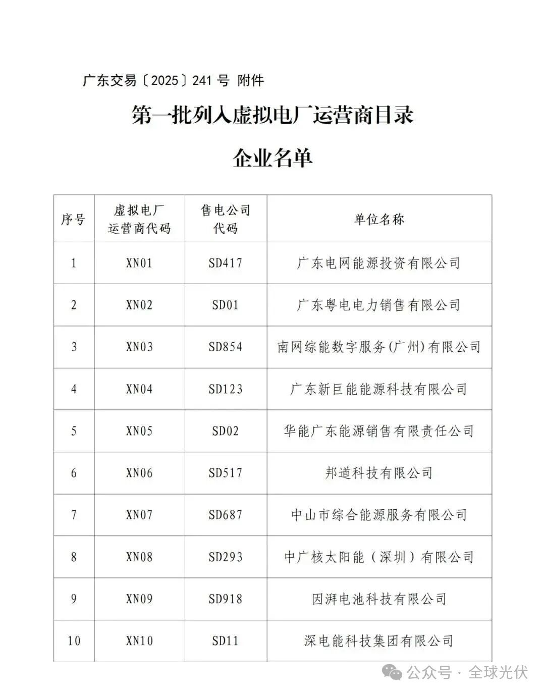 通知明确,上述10家经营主体在广东电力市场的注册登记自动生效,名单详情可查阅附件《第一批列入虚拟电厂运营商目录企业名单》。具体内容如下: