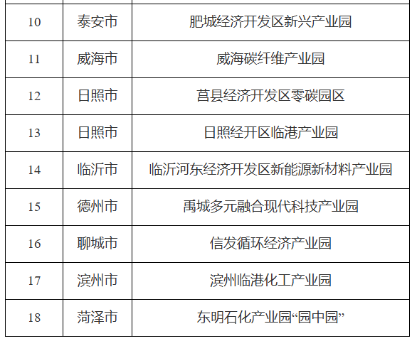 其中潍坊、济宁、日照3地入选了2个园区,济南、青岛、淄博、枣庄、烟台、泰安、威海、临沂、德州、聊城、滨州、菏泽15地各入选了1个园区。