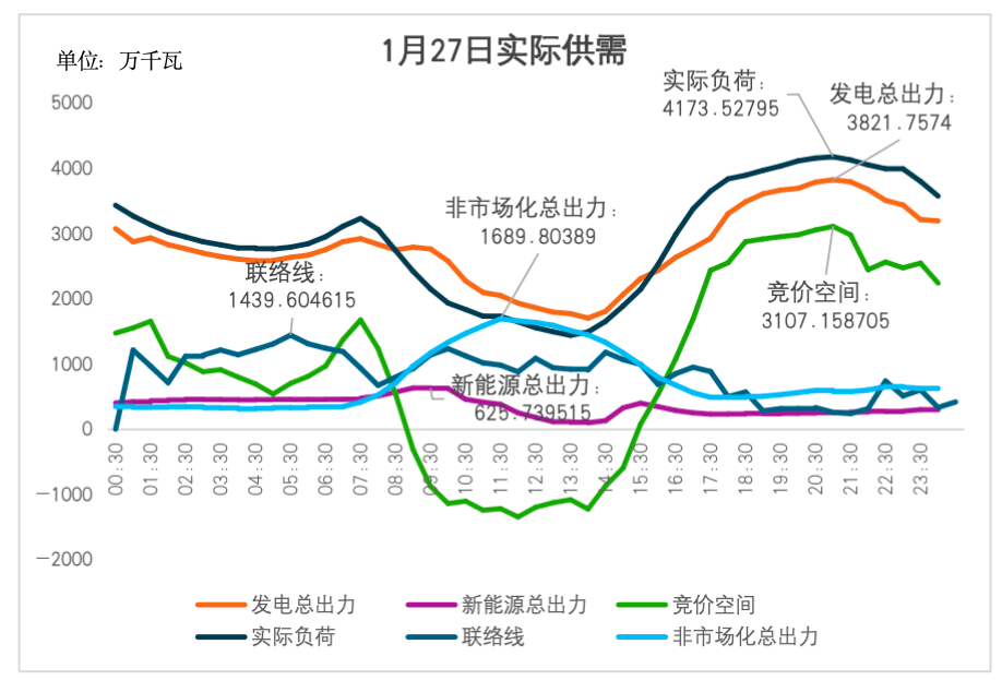 2025年1月27日,浙江电力市场实际供需图(来源:国能日新)