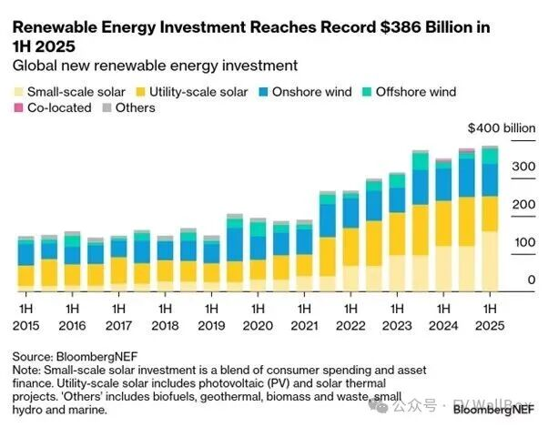 其中,海上风电(Offshore Wind)在2025年上半年吸引了约390亿美元的新投资,已经超过2024年全年水平,体现出大型风电项目在政策支持下的抢装热情。但更令人意外的是,小规模的分布式光伏项目表现抢眼。BNEF报告指出,上半年全球小型光伏项目(主要指户用屋顶和小型工商光伏)投资额激增,在一定程度上抵消了大型项目投资的下滑。这标志着全球新能源投资进入了一个新周期:资金正从过去偏爱的超大规模项目的一枝独秀,逐步转向“大项目+小项目”双轮驱动的新格局。
