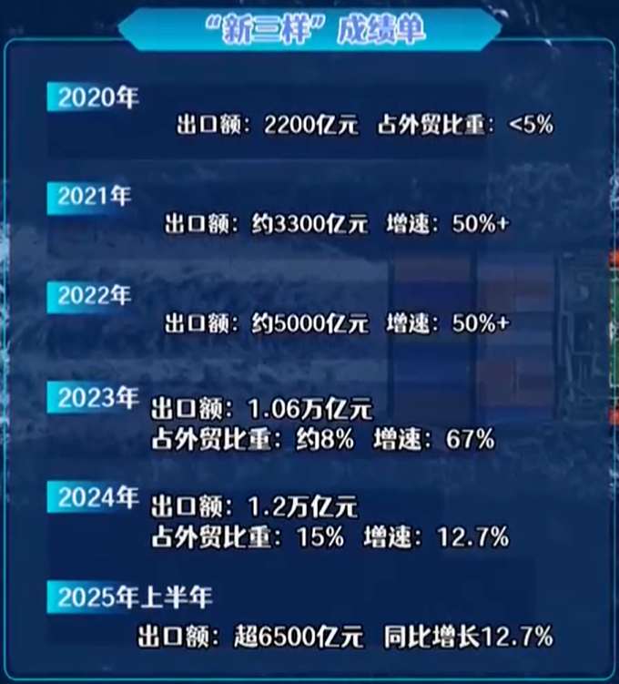 刚才二位给我们带来的这两张照片,都是二位的高光时刻的一个缩影。其实我们新三样出海的这 5 年时间里,也取得了非常令人欣喜和惊讶的成绩,我们也给大家总结了一份成绩单,一起来看一下。这是我们外贸“新三样”出海的第一份成绩单,这份成绩单我们从数字上就能看得很清楚。从 2020 年出口额是 2200 亿元,占的外贸比重不到5%,到 2024 年的时候达到了 1.2 万亿元,在五年的时间里增长了 5 倍多,也看出了我们“新三样”真正成为了我们最近一段时间外贸领域的顶流。