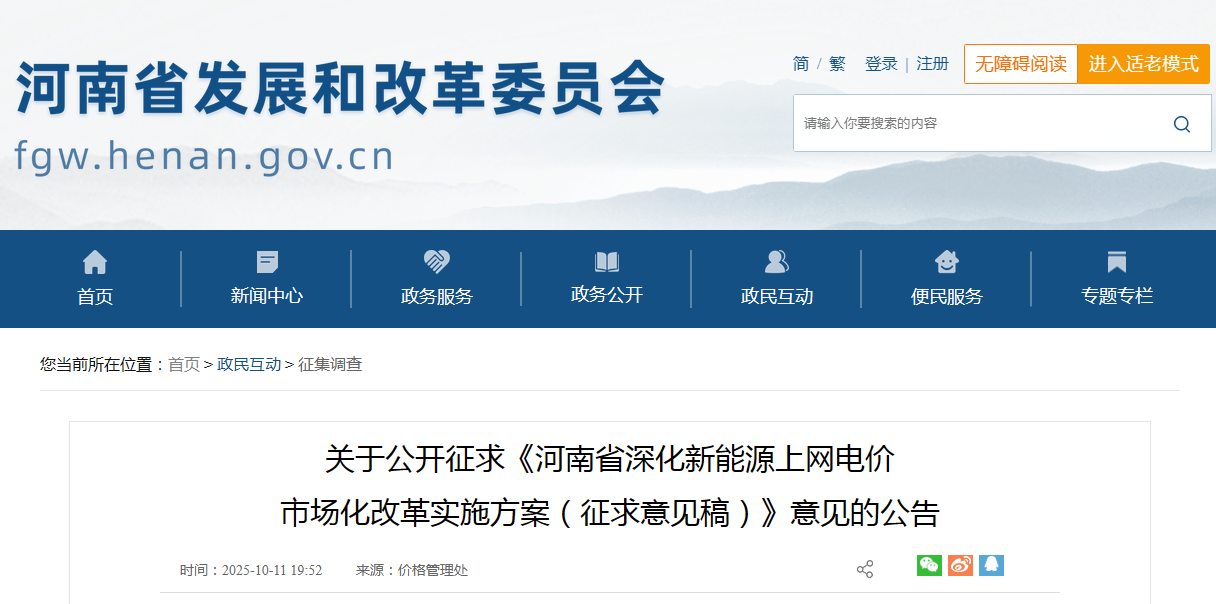 10月11日,河南省发改委发布关于公开征求《河南省深化新能源上网电价市场化改革实施方案(征求意见稿)》意见的公告。