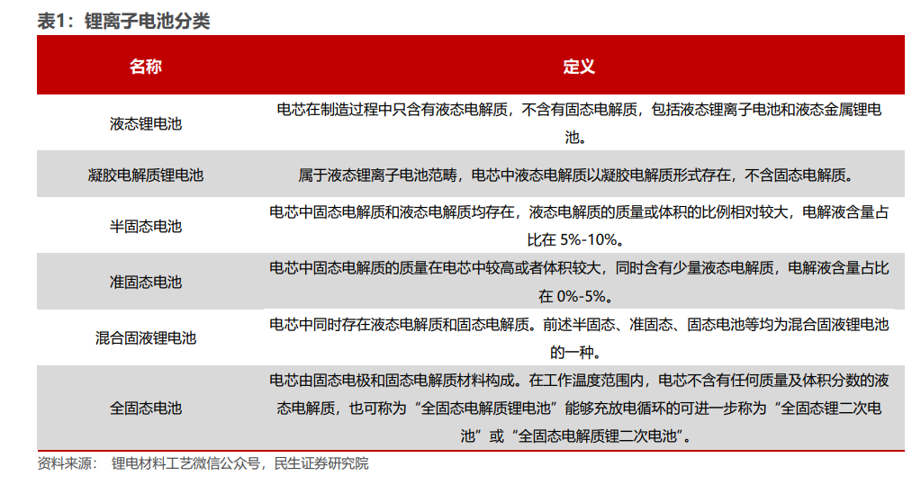 根据液态电解质占电芯材料混合物的质量分数分类,电池可细分为液态 (25%)、半固态(5%~10%)、准固态(0%~5%)和全固态(0%)四大类,其中半固态、准固态和全固态3种统称为固态电池。