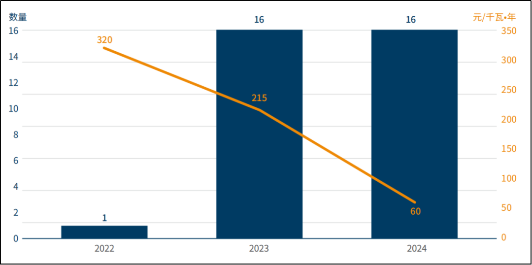宁夏的容量租赁成交项目在全国范围内最多,在容量租赁政策发布的首年(2022年),成交项目1个,租赁价格达到320元/千瓦·年;次年成交项目16个,加权平均价格在215元/千瓦·年;2024年成交项目16个,加权平均价格跌落到60元/千瓦·年左右,容量租赁成交价格呈现出明显的逐年减少的趋势。