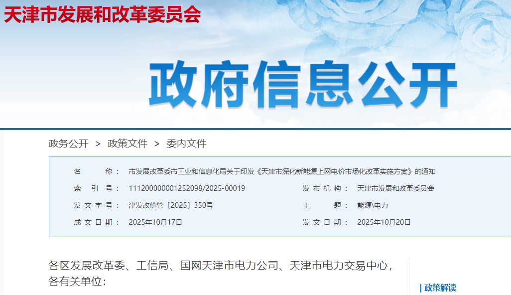 方案表示,全面放开新能源上网电价。自2026年1月1日起,天津市新能源项目(风电、光伏发电,下同)上网电量原则上全部进入电力市场。2026年1月1日以前,新能源发电上网电价仍按照现行政策执行。